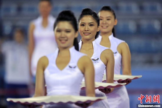 礼仪小姐是深圳大运会颁奖仪式上一道靓丽的风景线。图为8月13日礼仪小姐们在比赛间隙刻苦训练。中新社发 金硕
