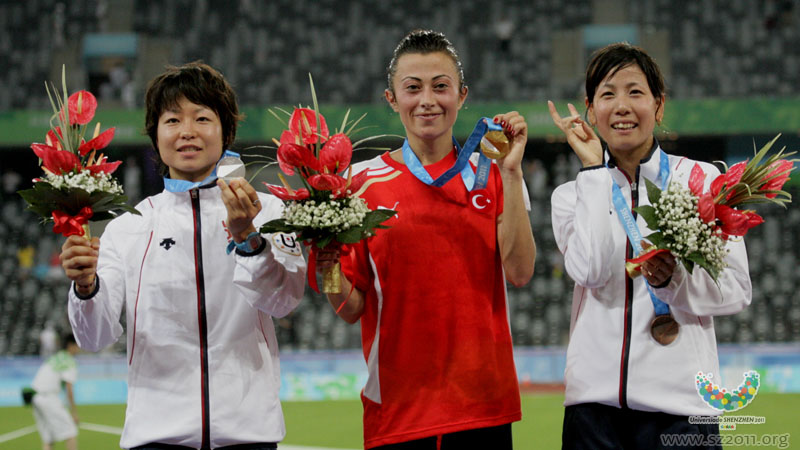 8月16日,在深圳大运会女子10000米决赛中,土耳其选手苏纳(中,SUNA Fadime)夺得金牌,日本选手田中华绘(左,TANAKA Hanae)、石桥麻衣(右,ISHIBASHI Mai)分别夺得银牌、铜牌。 大运会官方图片社 刘伯良 摄