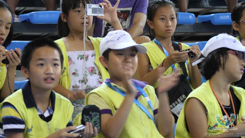 8月15日,深圳市学生通讯社的小记者在深圳大运会举重赛场认真观看比赛。大运会官方图片社 章力 摄