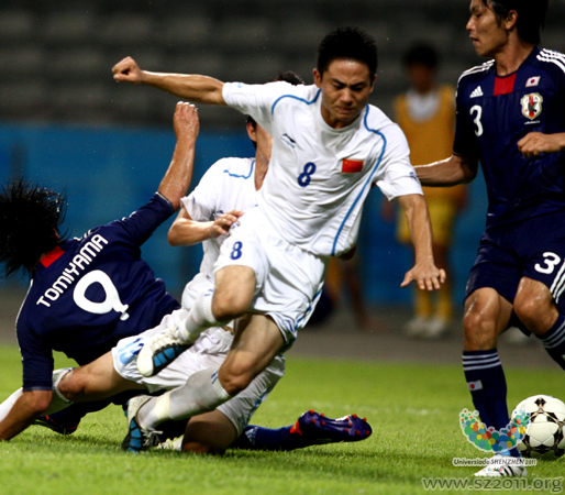 8月18日,在第26届世界大学生运动会男子足球1/4决赛中,中国队对阵日本队。图为中国队球员刘猛(中)在比赛中拼抢。(大运会官方图片社 郑东升 摄)