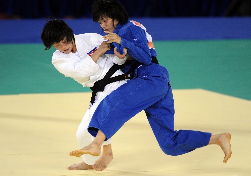 连珍羚(右)在广州亚运会柔道女子57公斤级比赛中摘铜