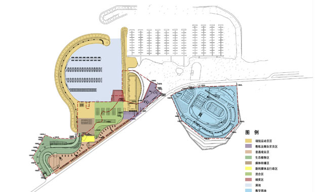 该场地建设船艇泊位约200个,护岸长263.5m,防波堤总长410m,主要用于停泊比赛船、教练船。