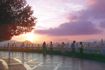 早上6时是上莲花山的好时候,天色大亮,而城市还刚刚从沉睡中醒来。迈步进园,这里的黎明静悄悄,园中有稀疏晨运的人,都是很健康的步履和 脸色。空气特别清洌,忍不住抬腿慢跑,选择南面的林中小径上山。跑上5分钟不到,就是一条通往山顶的石阶路,和湖边那条石阶路相比,这条绿阴覆盖的小路更 加宁静。可以慢跑、可以拾阶而上,渐渐听得到心跳的声音,树梢上有小鸟和鸣。一天之中,也许只有这时的莲花山能听到如此清脆的鸟鸣声。