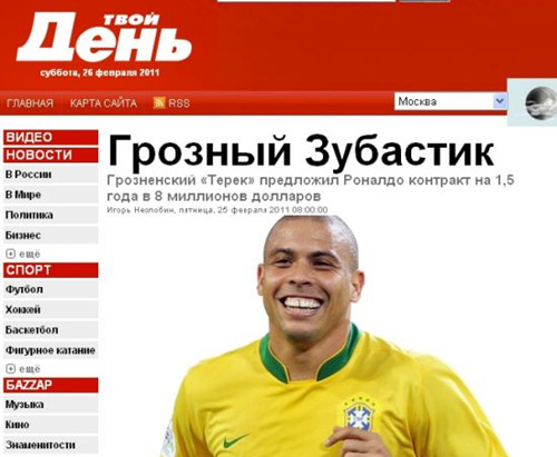 消息的最初来源是俄罗斯当地媒体《Tvoi Den》的爆料,上赛季排名俄超第12位的格罗兹尼特雷克队正式发出邀请,希望外星人能够闪电复出,接受一份合同期为一年半、价值580万欧元的合同。而一旦决定奔赴俄超,罗纳尔多也并不孤单,好友罗伯特-卡洛斯几天前刚刚加盟了俄超马哈奇卡拉队。