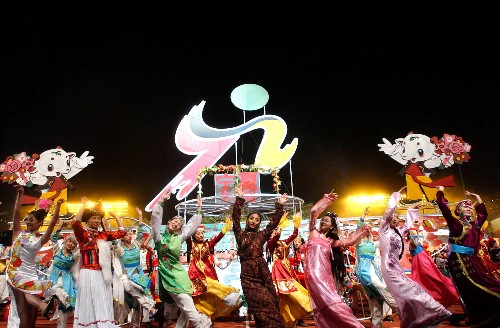 9月6日,在银川宁夏体育场举行的民运会开幕式文艺表演中,演员们伴着乐曲载歌载舞。当日,第七届全国少数民族传统体育运动会在宁夏回族自治区首府银川市隆重开幕。新华社记者摄