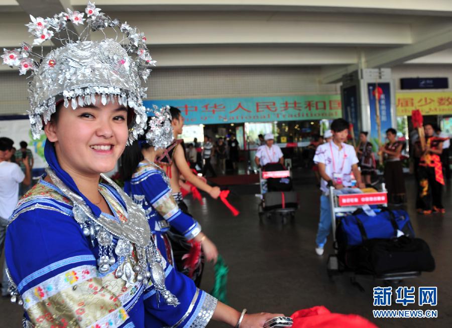 9月7日,东道主以当地少数民族歌舞迎接参赛团。当日,来自全国各地的第九届全国少数民族传统体育运动会参赛团在贵阳市龙洞堡机场受到东道主热情接待。新华社记者梁强 摄