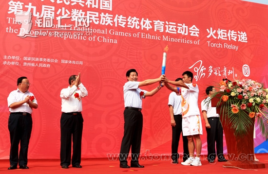 9时56分,火炬传递仪式开始。谢庆生宣布火炬传递开始,并将点燃的火炬交给廖国勋,由廖国勋交给第一棒火炬手——曾获“第七届全省少数民族运动会道德风尚奖”的铜仁学院学生田文智。田文智高擎火炬向全场示意,顿时,现场掌声、欢呼声热烈响起。