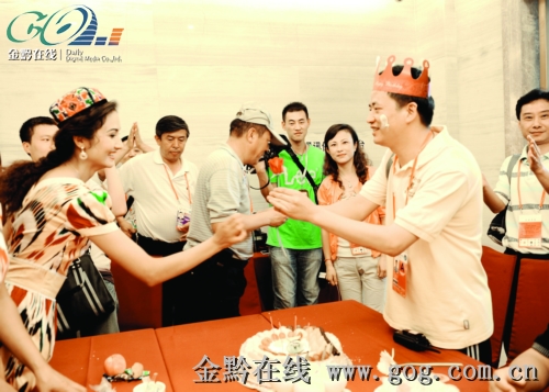 昨日,贵阳市云岩公安分局驻西湖花园酒店安保指挥室民警与新疆代表团一起欢度中秋,共赏明月。当天也是该酒店安保指挥室指挥长胡康43岁的生日,新疆代表团的维吾尔族姑娘为他献上了一朵火红的玫瑰。