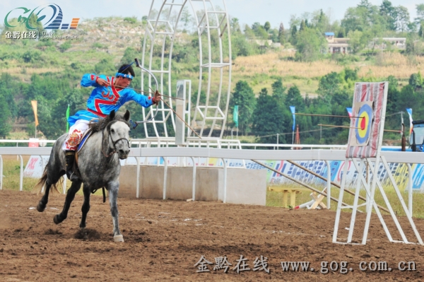 来自内蒙古自治区阿拉善盟选手在民族运动会上表演骑马射箭