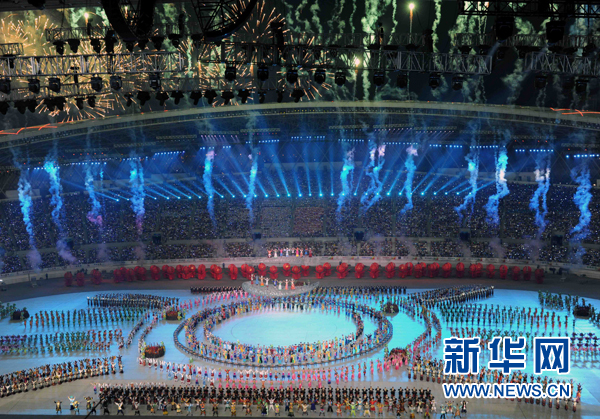 第九届民族运动会规模空前,凝聚在中华民族的伟大旗帜下,55个少数民族的6773名运动员,在动人心弦的比赛和表演现场,在美好团圆的中秋联谊的夜晚,在民族大联欢的绚丽舞台上,同台竞技,尽展风采,共同谱写出民族团结新的华章。
