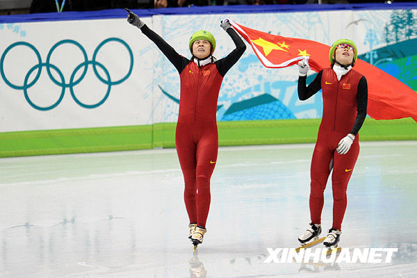 2月26日,在温哥华冬奥会短道速滑女子1000米决赛中,中国选手王濛以1分29秒213的成绩夺得冠军。这是王濛(左)夺冠后与队友周洋手持国旗庆祝。新华社记者杨磊摄