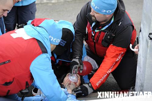 2月12日,在冬奥会雪上项目主战场加拿大惠斯勒,医护人员紧急抢救受伤的格鲁吉亚无舵雪橇运动员诺达尔。当日,诺达尔在备战冬奥会的训练中严重摔伤,不幸死亡。