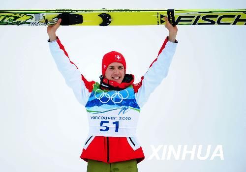 2月13日,瑞士选手西蒙·阿曼庆祝夺冠。当日,在加拿大惠斯勒进行的冬奥会男子跳台滑雪比赛中,西蒙·阿曼两跳拿到276.5分,获得跳台滑雪标准台K90男子个人比赛金牌,这也是本届冬奥会的首枚金牌。