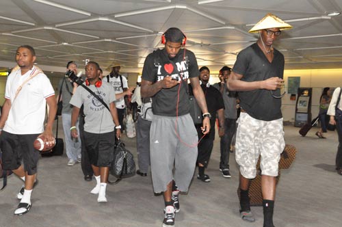 综合台湾媒体报道,美国职篮NBA球星姚明、“魔兽”霍华德等多人访台,他们抵达机场后受到大批球迷欢迎。姚明说,希望能为两岸孩童多做一点事,并鼓励“八八”风灾受灾学童,与小朋友一起分享篮球乐趣。