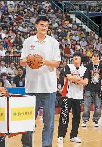 姚明在艺人投篮比赛时帮忙喂球,周杰伦站在后方观看