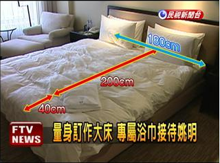 报道称,姚明7月底将现身台北,要迎接这位身高2米26的超级巨人,下榻饭店的规格当然要非常大。原本2米长的床,加长到2米40,宽度也从1米80增加到2米,一般人在上面翻滚两圈半,都不会落地。