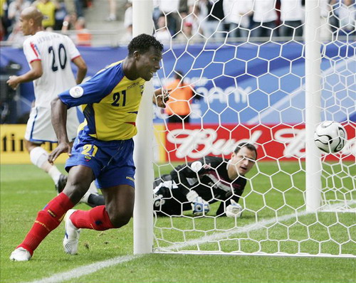 世界杯A组第二轮厄瓜多尔与哥斯达黎加的比赛在汉堡举行。厄瓜多尔队第一轮2-0战胜波兰,哥斯达黎加则在开幕战中2-4不敌德国。图为特诺里奥庆祝进球。