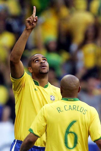 下半时一开始,罗纳尔多就中路强突赢得任意球。第49分钟,罗纳尔迪尼奥直传左肋,罗纳尔多禁区前沿虚晃,面对尼尔和埃默顿的封堵左脚横敲中路,阿德里亚诺左脚脚底停球往左一拨,在禁区线上低射钻过奇珀菲尔德裆下窜入右下角,1比0!巴西队员们围在一起做出摇篮动作,庆祝阿德双喜临门。赛前2天,他的儿子在巴西诞生。
