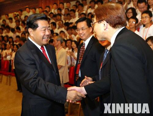 8月20日,中共中央政治局常委、全国政协主席贾庆林在北京会见参加“两岸同胞携手迎奥运”青年交流活动的全体代表。新华社记者 李涛 摄