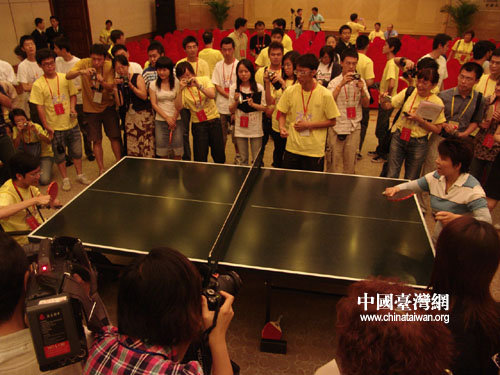 中国台湾网8月23日北京消息 参加“两岸青年携手迎奥运”交流活动的代表们22日上午与三位奥运会冠军在北京齐聚一堂。两岸青年与睿智善言的邓亚萍、诙谐幽默的杨凌、美丽动人的杨扬交流并得以与之切磋球技。
