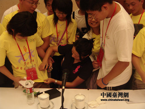 杨扬也忙得不亦乐乎。她的身旁围了许多争着照相、索要签名的青年代表们。“没想到奥运冠军会那么漂亮!”,“她不像练体育的啊,更像是拍电影的,怎么看那么像赵雅芝啊!”,这样的惊叹不绝于耳。杨扬一一满足了大家的要求,并在短短的时间内与台湾青年代表们交上了朋友。。(徐唯实)