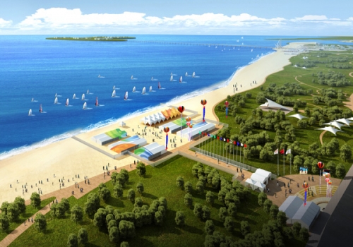 位于海阳凤翔滩B区(海阳旅游度假区沙雕公园区东门处沙滩),占地面积约10000m2,北侧为海阳国际沙雕艺术公园,设计观众临时观看区域。功能区设置了体育竞赛区、场馆礼宾区、安保及交通运行区、新闻运行区、场馆运行区及观众活动区。该项目距离亚运村4.5km,约10分钟车程。