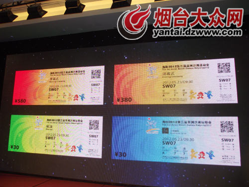 今天下午,海阳2012第三届亚沙会门票票样揭晓。本届亚沙会门票实行低价位销售原则,开闭幕式门票最高价为2880元,最低价为120元,竞赛门票最低价为20元。共有四种渠道可以购买亚沙会门票,6万张门票将分阶段销售。