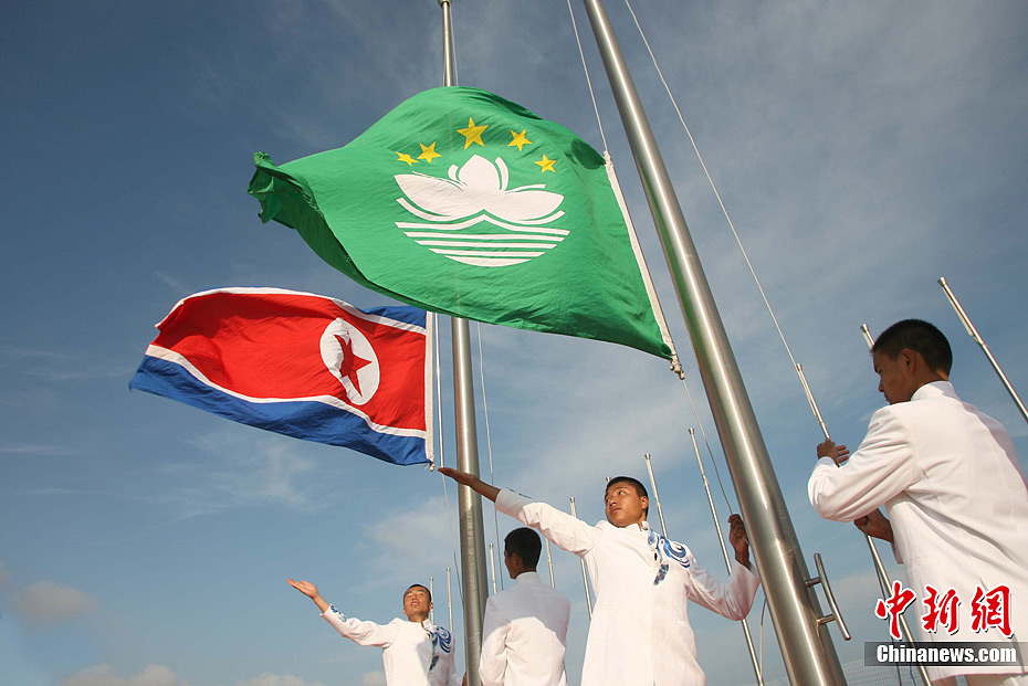 6月13日,记者在第三届亚沙会举办地山东海阳海滨沙滩篮球训练场地见到亚沙会国旗护卫队的一个小组正在训练。此次亚沙会武警烟台支队国旗护卫队肩负亚沙会期间的升旗护旗任务。护卫队队员身高在1米8至1米83之间,体重、臂展都有要求,共有59名武警战士入选亚沙会国旗护卫队,其中最小的只有18岁。图为升旗、甩旗,每个人都有明确分工。杨兵摄