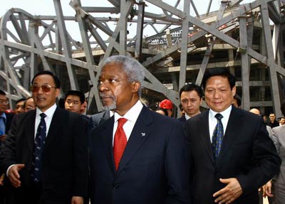 安南(中)在刘淇(右)等陪同下参观鸟巢工地