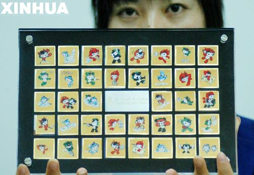 第29届奥林匹克运动会吉祥物运动造型金银纪念牌于5月26日在全国发行。金银牌均有38个吉祥物运动造型。金牌1套38枚,单枚重量10克,发行量3000套;银牌1套38枚,单枚重量8克,发行量8000套。新华社发(王建中 摄)