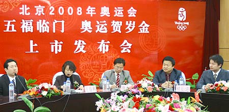官方网站11月29日讯 今天上午,第一套北京奥运贺岁金“五福临门奥运贺岁金”在北京2008年奥运会特许商品销售店北京菜市口百货店上市发行。