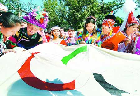 各民族代表在北京中华民族园,用土家族十字绣针法,绣制奥运五环旗