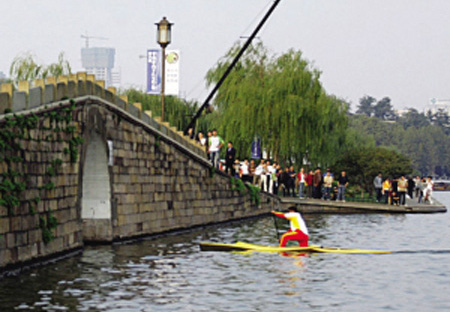 昨天,杭州白堤上,奥运冠军孟关良与一群杭州市民正在联手演绎一部宣传2008年北京奥运会的公益广告片。从上午8点多开始到下午4点,拍摄现场始终受到了大批热心市民的关注。 (来源:中国新闻网 作者:李颀拯)