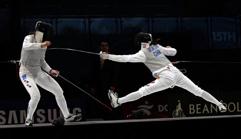 12月14日,中国队选手苏婉文(右)在比赛中进攻。当日,在多哈亚运会女子花剑团体决赛中,中国队以37比45负于韩国队获得银牌。新华社记者陈晓伟摄