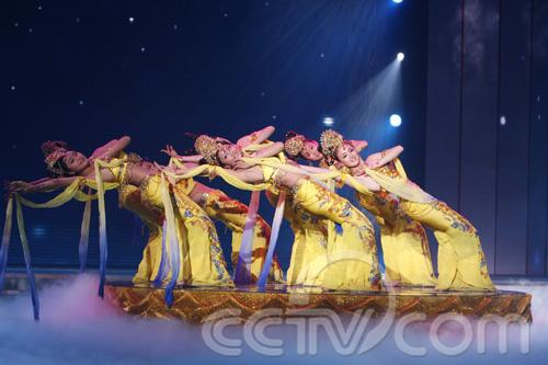 随着悠长的圆号声,舞台烟涛微茫,浩荡广宇,莲花台上七个婀娜的仙女出现了,她们身披彩带,笑容靓丽,秀影灵动,在阵阵仙声中舞姿翩翩,彩带飘逸……看着看着,我们对她们的舞姿突然有点诧异——因为她们用失衡的身姿、倾斜的丽影让我们领受到一种从来没有见过的美感,她们用失衡和倾斜制造的美,让我们陡然生出仙女飞天的飘动感觉,只见她们忽而嫦娥奔月集体前倾,忽而童子拜佛婷婷玉立,忽而龙女探海眺望人间,忽而反弹琵琶畅行空中,最精彩的是七个仙女大幅度全身后倾,持彩带飘空,呈仰飞天行空之态,婉若敦煌飞天仙子再生……俄而,仙乐突转活泼的弹拨乐的生动旋律,诸仙女一改端庄,轻扭秀腰,你闪我躲,嘻闹不停,一时,动中出静,静中有动,众仙女媚态娇态齐生,各秀其姿,悦人耳目……忽然,众仙女稍作收敛,整肃一致,再次做出前倾、后倾、侧斜、前探等动感强烈的飞行姿态,仙乐飘飘,声鼓齐呜,让我们突然想起李白那梦幻般的诗句:云青青兮欲雨,水淡淡兮生烟……青冥浩荡不见底,日月照耀金银台。霓为裳兮风为马,云之君兮纷纷而来下。 虎鼓瑟兮鸾回车,仙之人兮列如麻……太美了!让我再回到舞台上——只见七仙女飞逸的身影后的天幕上出现耀目的眩亮和飞天仙子们天际横飞的景象,天上撒下阵阵花瓣——莫不是月宫已到?仙女们各显其姿,各移倩影,笑容可掬,百媚丛生,最后仙乐推向高潮,七仙女象美丽的雕塑倩立在莲花台上……