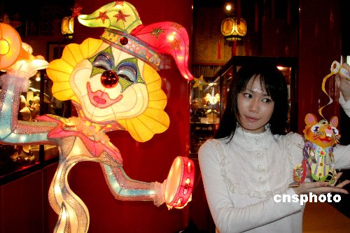 一月二十一日下午,台湾二○○八年灯会主灯暨小提灯造型在台北揭晓,因为今年是中华民族传统的鼠年,所以两种灯的造型都是以鼠生肖来创意设计,堪称“鼠年灯会鼠做主”,主灯和小提灯分别被命名为“礼鼠献瑞”、“活力鼠”,颇受民众喜爱与欢迎。图为一位女孩向媒体展示小提灯“活力鼠”。 中新社发 孙自法 摄