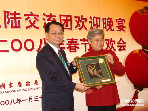 中国宋庆龄基金会副会长唐闻生(右)与交流团团团长台湾十大杰出青年基金会监察人陈建骐先生互换礼品