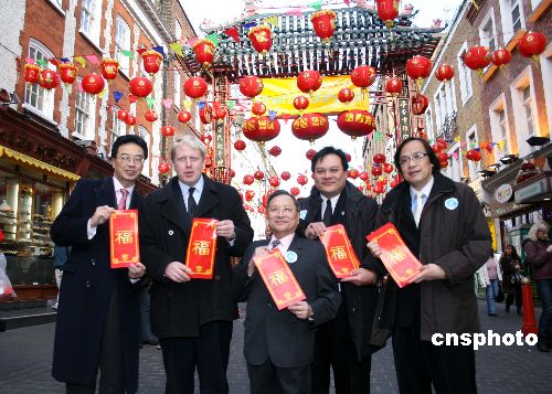 当地时间2月7日(农历年初一)下午,英国保守党伦敦市长候选人鲍里斯·约翰逊来到伦敦唐人街,向华人拜年。图为鲍里斯(左二)、伦敦华人区议员陈德樑(左一)、杨庆权(右二)和英国华人保守党主席李锦怡(中)在伦敦唐人街。