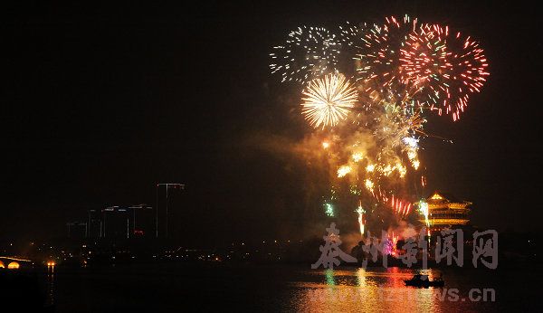 当晚的焰火燃放,从晚上8点正式开始,负责本次焰火燃放表演的是海陵区海唯商贸有限公司。公司负责人王春红说,他们从事大型焰火表演工作已经有年头了,在行业内部也颇有名气,为了确保元宵节的焰火表演质量,过完年,他们就在张罗这件事。燃放的花炮都是年前专门从湖南浏阳购置的,虽然价格不是特别昂贵,但品质都是一流的。他说,这一场表演和商业表演不同,是借机会向市民拜年,他们在准备时,也都特别卖力,负责安放的师傅忙碌了十几天,就为这十几分钟。