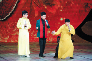 同样在元宵晚会上操着乡音上舞台的还有来自菏泽的草根明星刘大成。不过,这次刘大成和周炜等三人却说起了相声《小合唱2》,刘大成搞笑的功夫和高超的模仿技艺让观众大开眼界。他先后用水管、吸管、梳子吹出各种曲子,更用口技的绝活模仿绛州鼓乐、二胡。刘大成模仿殷秀梅《我爱你,塞北的雪》、蒋大为《在那桃花盛开的地方》等歌曲完全不在话下,他更挑战美声《祝酒歌》而且是男女合唱版的,实力简直可以抢李玉刚的饭碗。接受采访时被问及上元宵晚会是否紧张,刘大成笑说:“上过春晚那么大的舞台已经害怕过了,现在就不害怕了。”此话逗得主持人和台下观众直乐。刘大成的节目也被网友评价为集搞笑和才艺于一体、最值得看的节目。(记者 郇志君)
