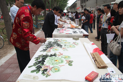中国台湾网5月27日洛阳消息 男女老少画牡丹,幸福生活吉祥如意。这就是5月27日第八届“网上看河南”北线采风团在洛阳孟津县平乐镇平乐村看到的景象。