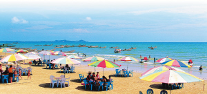 东兴以美丽的山海风光、优美的海滨浴场、浓郁的京族风情和方便快捷的跨国旅游,形成了以跨国旅游为龙头,“上山下海又出国”的旅游知名品牌。图为游人如织的东兴金滩。