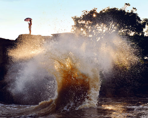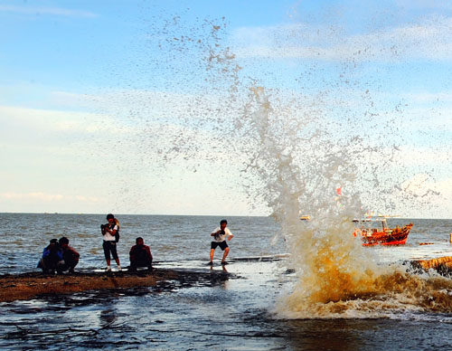7月2-6日,广西钦州市三娘湾举办一年一度的观潮节。连日来,天文大潮气势恢宏,巨浪扑击岩石,溅起十余米高,场面十分壮观.吸引了许多游客和摄影爱者前往观光。据景区门票收入统计,仅7月5日周六这一天,进入景区观潮的人数逾4万人次.