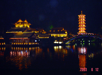 游客日夜可乘船游环城饱览桂林秀色,那些岛屿、绿树、亭台水榭、曲桥衔引、湖光山色在奇幻彩光下,变得色彩斑斓,扑朔迷离,月光、灯光与实景,浑然一体,四湖成了人间仙境。