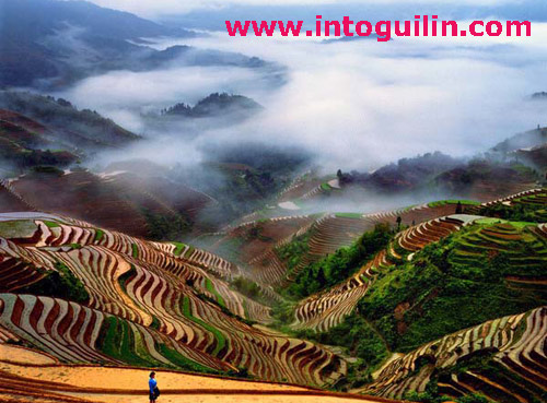 龙脊梯田位于广西龙胜县东南部和平乡境内,距龙胜县城27公里,距桂林市80公里,景区面积共66平方公里,其中最精华的梯田景区20平方公里,龙脊梯田区域内最高海拔1850米,最低海拔300米,梯田一般分布在海拔300米-1100米之间,坡度大多在26-35度之间,最大坡度达50度。高山、深谷、大落差,让龙脊梯田周边形成远有高山云雾,近有河谷急流的绝佳景观。 龙脊梯田始建于元朝,完工于清初,距今已有650多年历史,是广西20个一级景点之一。梯田如链似带,把一座座山峰环绕成一只只巨大的螺蛳,有的则像巨扇一样半合半开,斜叠成一个个狭长的扇;有的则像天镜被分割,然后有层次地镶嵌成多种图形的碎块,在这个广袤的区域内,小路悠悠地、蜿蜒在跌宕有致的梯田里,飘忽成一根根细绳;而袅袅地萦绕在它上空的龙脊壮族山歌,则缥缈成一缕缕缭绕的云烟;那一幢幢被水光映照、被云影拂弄的壮族“麻烂”(木楼),则被如画的景色空灵成仙宫了。 龙脊开山造田的祖先们当初绝没有想到,他们用血汗和生命开凿出来的梯田,竟是如此妩媚潇洒的曲线世界。在旅游已成为人们生活一部分的今天,壮族祖先们经手开出来的梯田,竟像艺术杰作一样愉悦着游人的情感,使众多的异国他乡的人,不远万里纷至踏来,欣赏它、口味它,并用心灵去感应它的魅力。