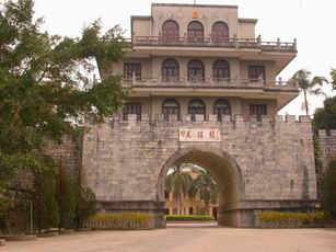 关楼底座上原来只建有一层木结构回廊,重建时改用钢混结构,并加了两层回廊,每层回廊平均为80平方米。回廊的四周是拱形大窗,窗棂装饰了各式图案,外墙为墨绿色石米贴面,显得庄严、古朴。