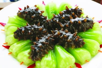 是防城港当地以北部湾所产优质海参为主料,经泡发、切片、煨烧等调制,配以虾胶瓤冬菇而成;在瓤制冬菇时用芫荽及火腿末点缀成花形,故名“春梅”。菜品软而不糜,滑溜可口,鲜味浓郁,清淡鲜嫩。