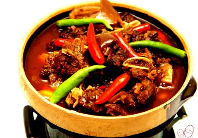 再说宰狗。此地杀狗之法,是以木棒敲击狗鼻使之倒地,然后趁其昏迷时放血刮毛,再用干稻草烧尽细微狗毛,而不需剥皮。烧毛时,必须把握火候,太猛则爆皮,太小则除不尽毛根。燎尽洗净之后,再将狗开膛取五脏。若五脏取得完好,不般不用水冲洗腹腔,以保持风味鲜美。剁狗肉时,要刀刀均匀,块块见皮。