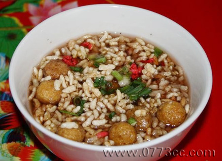 喝油茶必须配以各种佐食的小吃,都是各种油炸和炒香的食品。苗、瑶、侗等少数民族地区佐食多半是炒黄豆、炒花生米、爆玉米、炸花生米,再则就是糯米饭团或糯米粉糍粑。恭城平乐一带县城佐食则较为考究,酥炸小吃往往在十数种以上,请客人喝油茶往往摆上一桌子的小吃,看起来就像请客吃饭。侗族以油茶敬客是一种礼节,主人双手捧茶敬客,并说些谦恭的话,善歌者还以歌代言,客人必须喝完两碗,才算给主人面子,也是取“好事成双”之意。两碗之后不想再喝,便将碗筷一并交给主人,如果只交碗不交筷,则表示还想继续喝,主人就高高兴兴地再斟满一碗油茶送到客人手里。瑶族则在第一、二碗送来时不送筷子,并将米花、炒豆之类的小吃加入碗里。喝完碗里的茶还留些小吃在碗底,以示有余不尽,直到喝第三碗才送上筷子,所以客人必须喝三碗以上,只喝一两碗,主人会不高兴的。