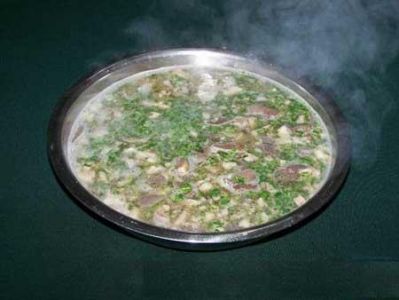 2、苦胆、泽兰味型:就是在热汤里加入适量的猪苦胆、鲜艳的泽兰叶(药材)一小把(切细),使之有一些苦味和泽兰香味。这种羊瘪汤具有辅助治病和明目的功效。